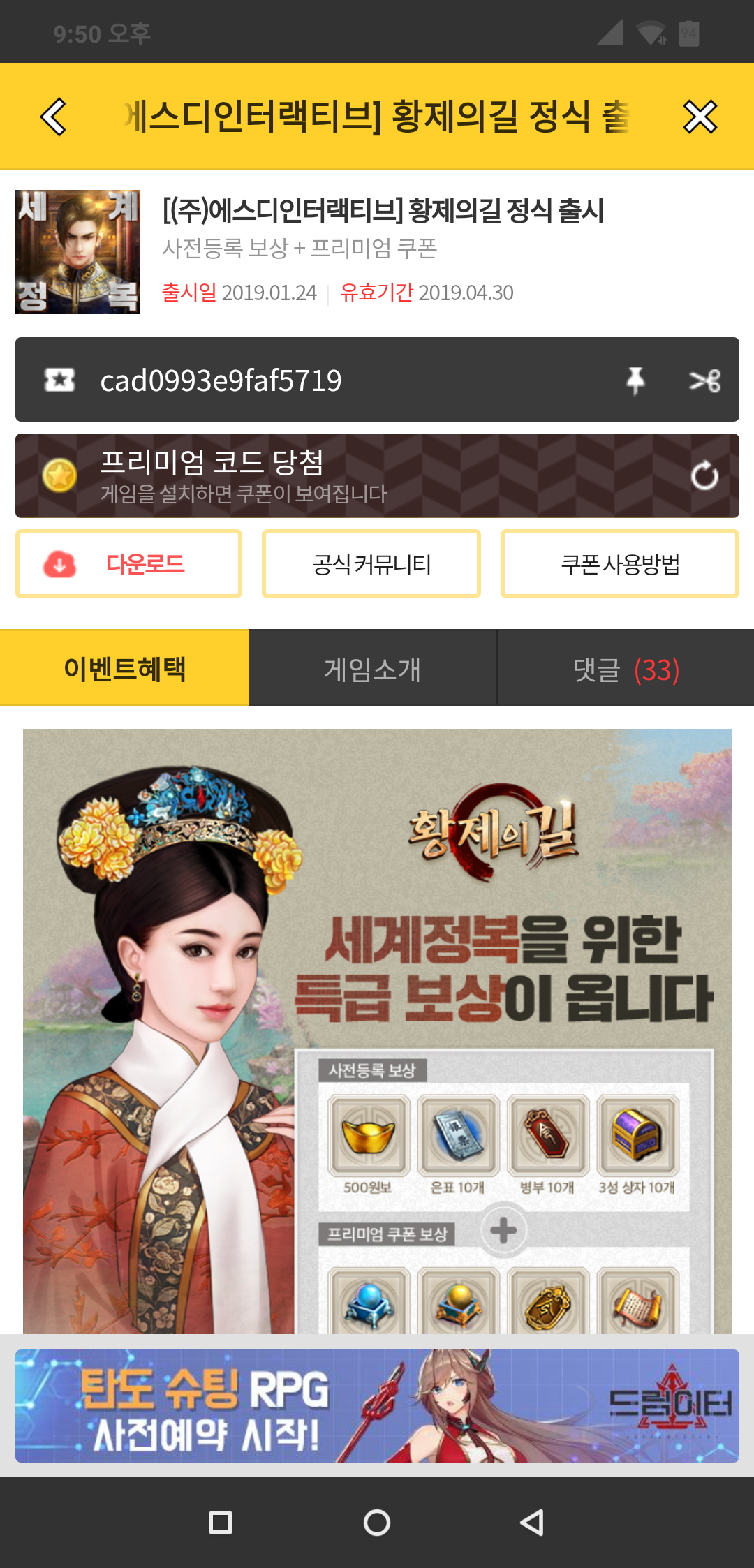[모바일게임] 황제의 길 사전예약쿠폰 나눔합니다.
